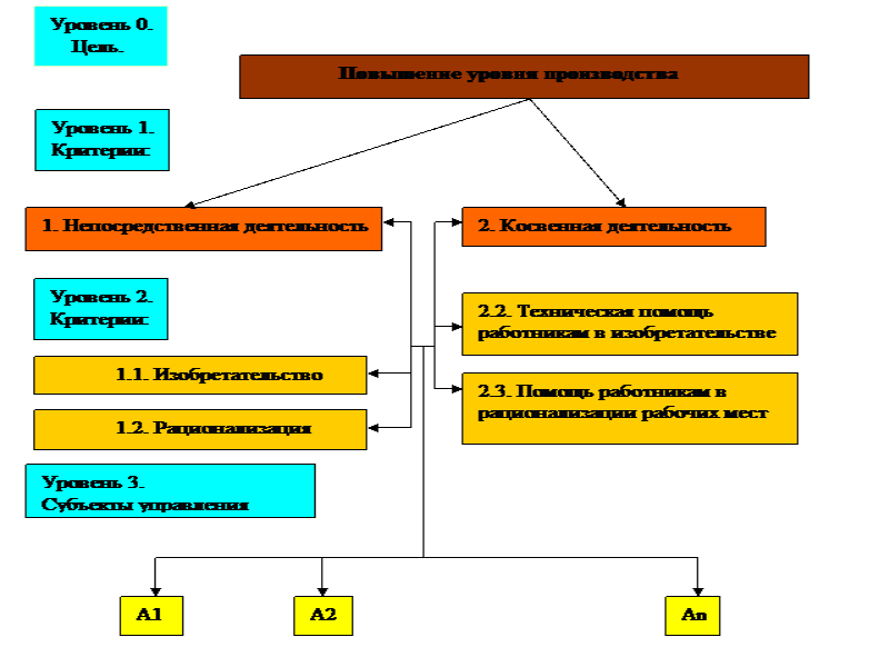 Одной из целей управляющей системы является задача повышения эффективности производства путем влияния на него научно-технического прогресса. Большое влияние на рост научно-технического прогресса на предприятии может оказать сам производственный персонал. На производственный процесс члены трудового коллектива могут оказывать двойственное влияние. С одной стороны они могут непосредственно участвовать в изобретательстве, рационализаторстве, применении на своем рабочем месте передовых приемов и методов труда, внедрять в производство новейшие технологии. С другой стороны, их деятельность может влиять косвенно, посредством их участия во внедрениях и пропаганде передовых приемов и методов труда. Подобное участие персонала в управлении производством можно представить в виде иерархической четырехуровневой структуры, изображенной на рис. 1.